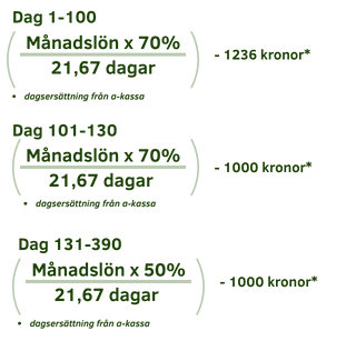 Dag 1–100: (månadslön × 70 % / 22 dagar) - 1236 kronor*  Dag 101–130: (månadslön × 80 % / 22 dagar) - 1081 kronor*  Dag 1–100: (månadslön × 50 % / 22 dagar) - 1082 kronor*  Dag 1–100: (månadslön × 50 % / 22 dagar) - 1005 kronor*  *dagsersättning från a-kassa